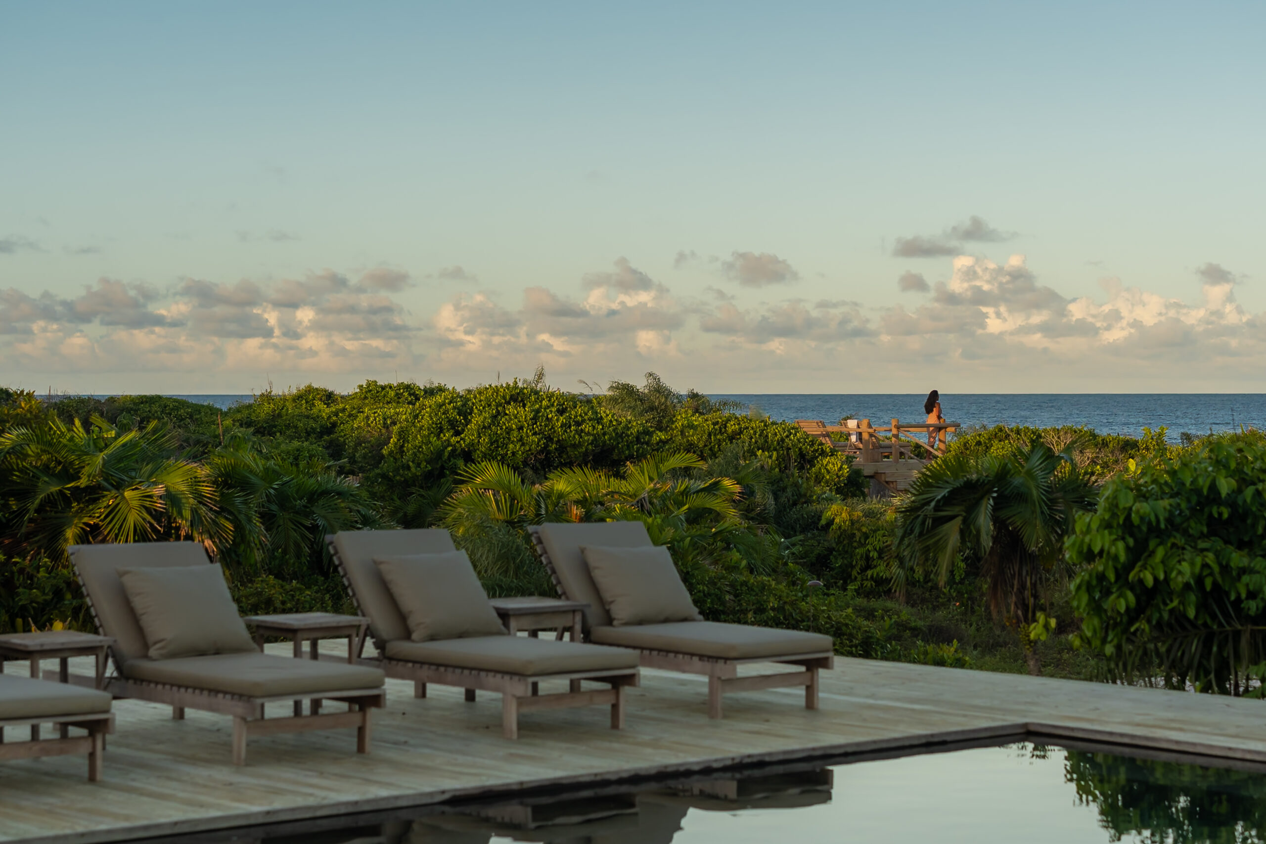 Pé na areia, toda feita com bambu e madeira de demolição, ela encanta de uma maneira única. A ampla sala, área de convívio principal, é uma grande oca coberta de piaçava que se abre para um deck com piscina vista mar.