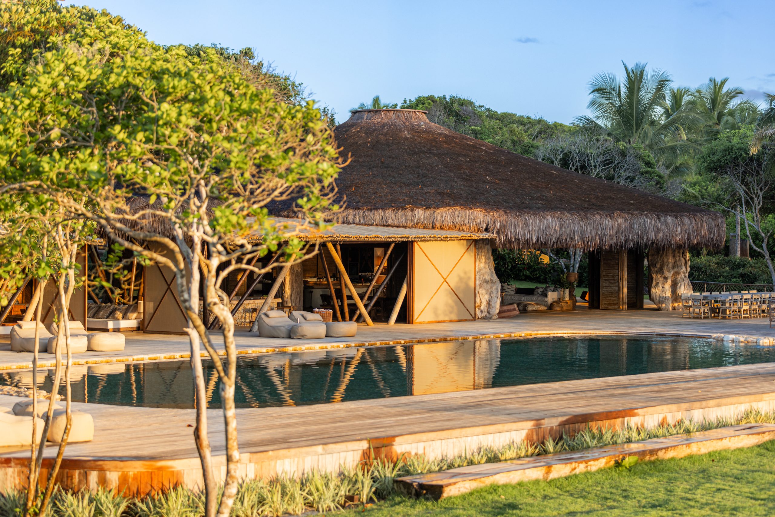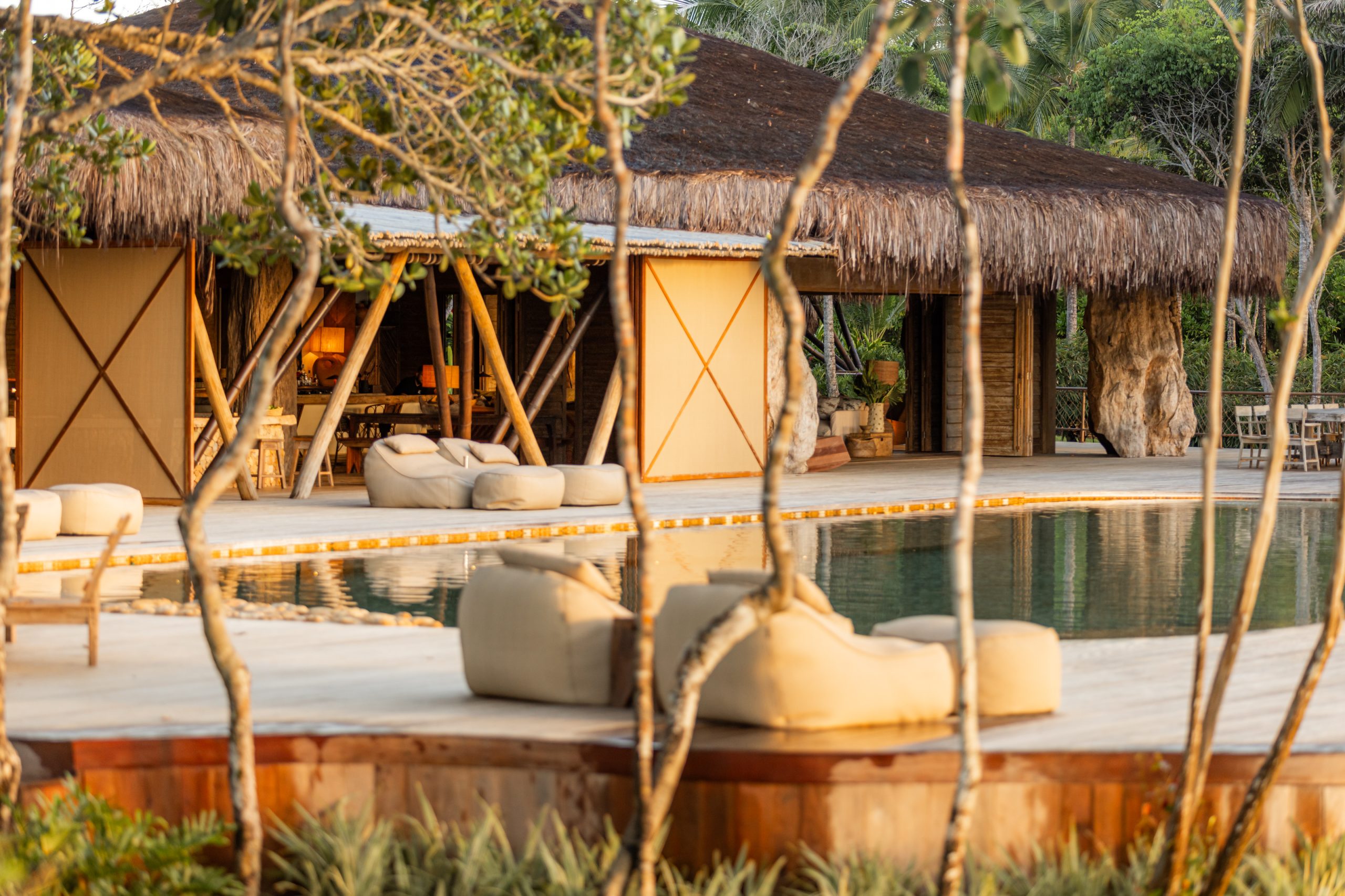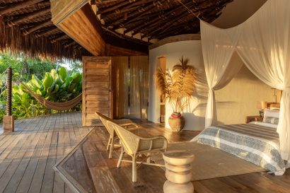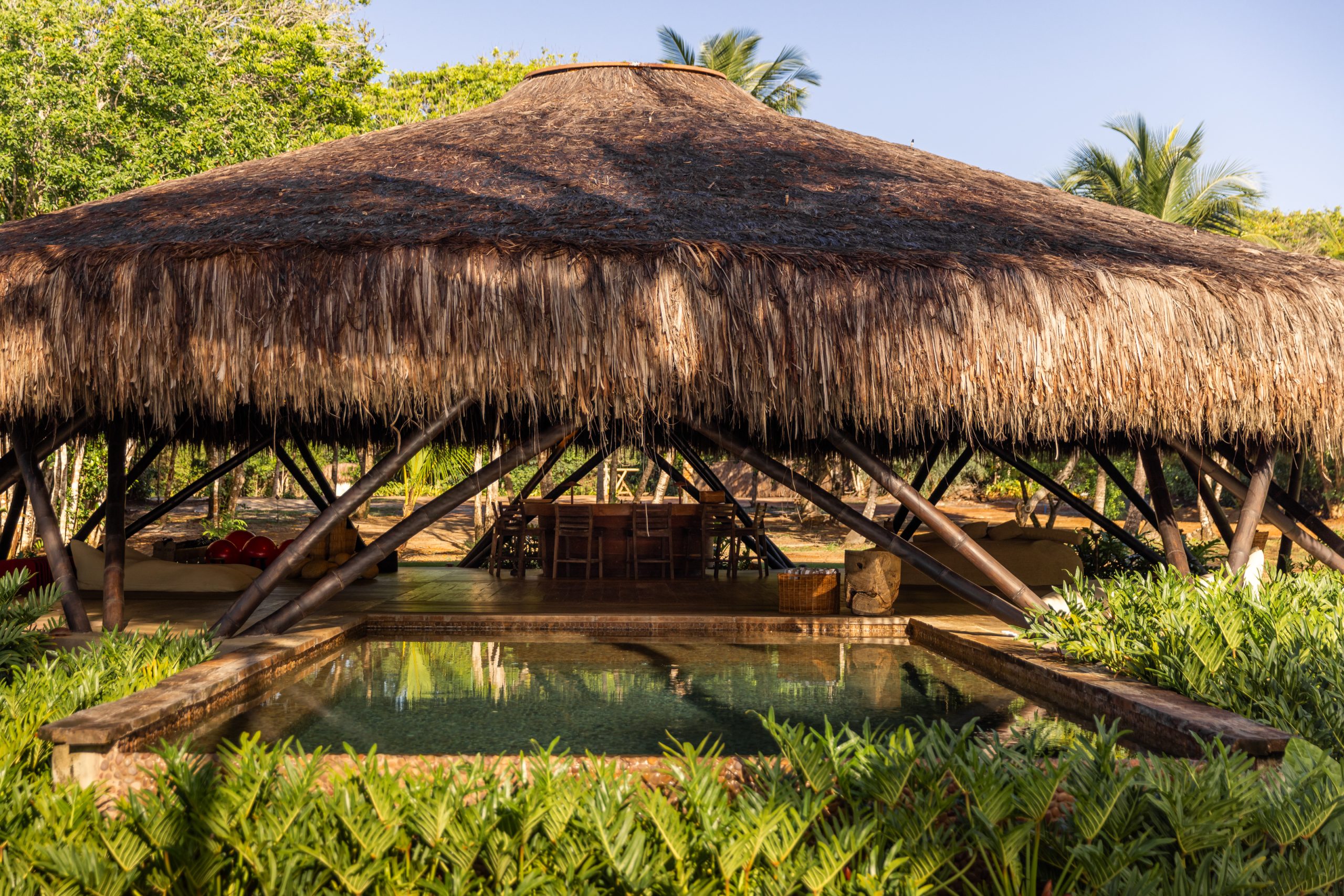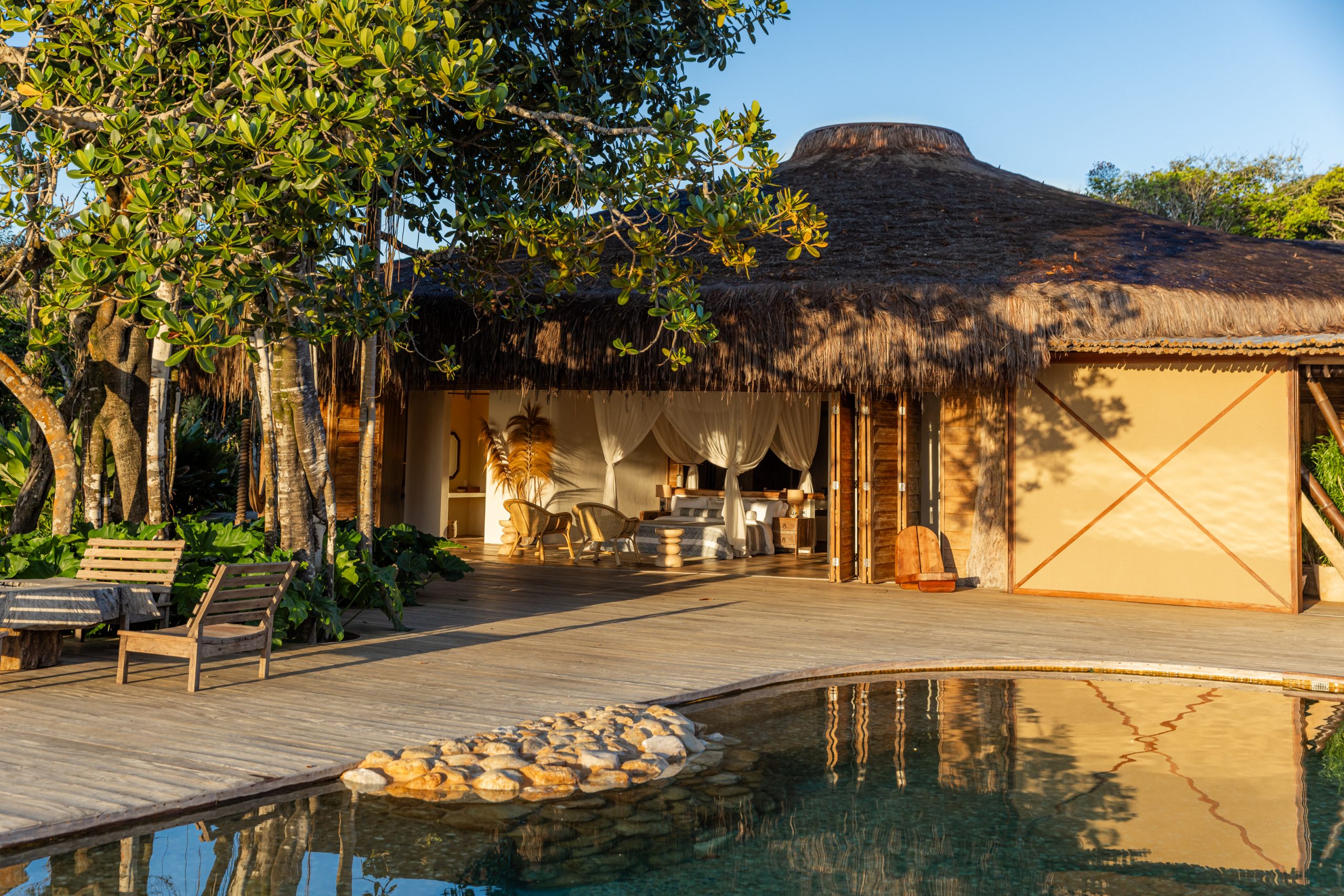 Overlooking the sea, the stone pool harmoniously integrates with the completely open and airy living room. And for even more relaxation, there’s a spa area with a sauna, massage room, and a giant pequi shower, all surrounded by lush tropical forest. Additionally, there’s the “Mandala” space: a large hut for healing therapies, yoga sessions, massages, and much more.