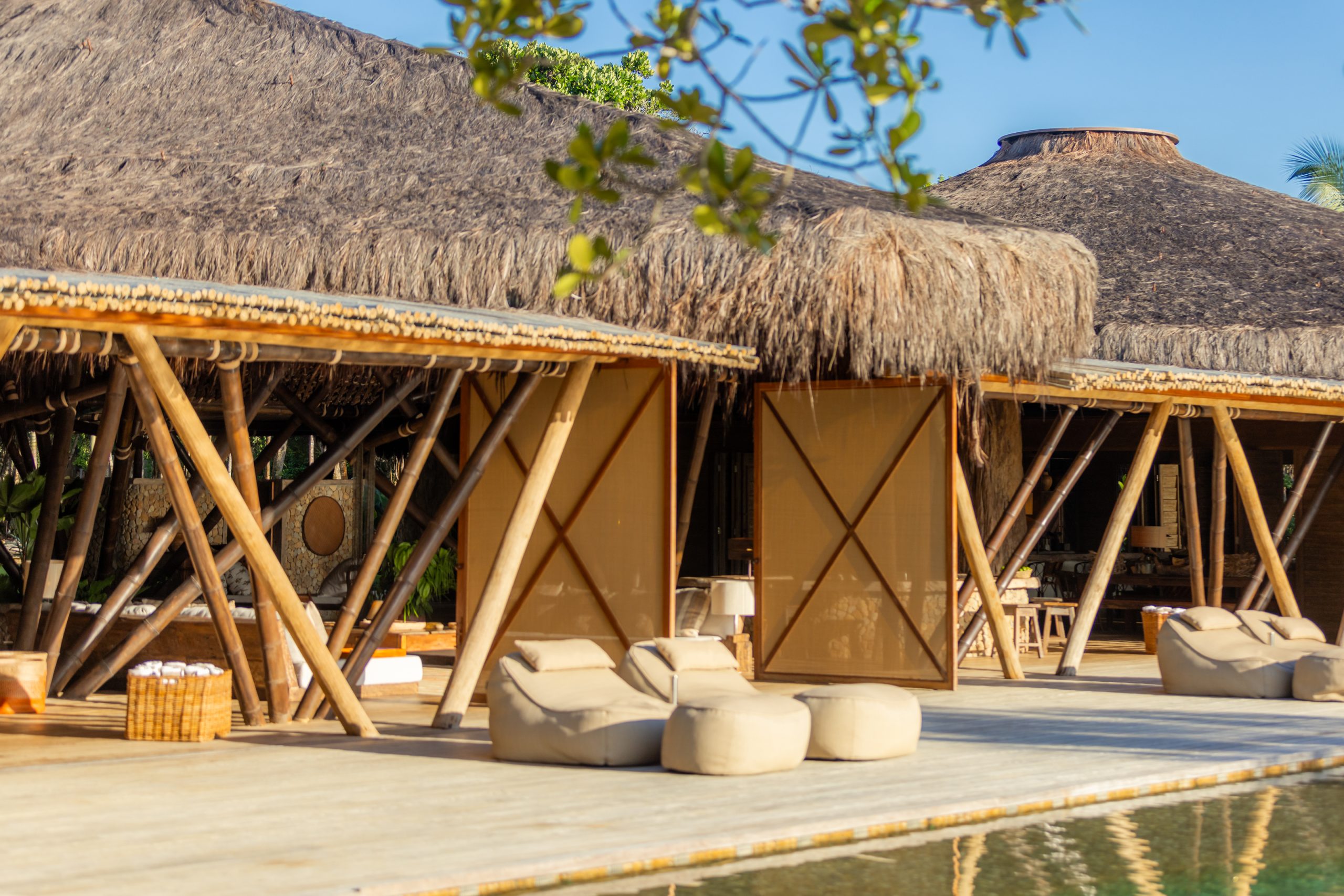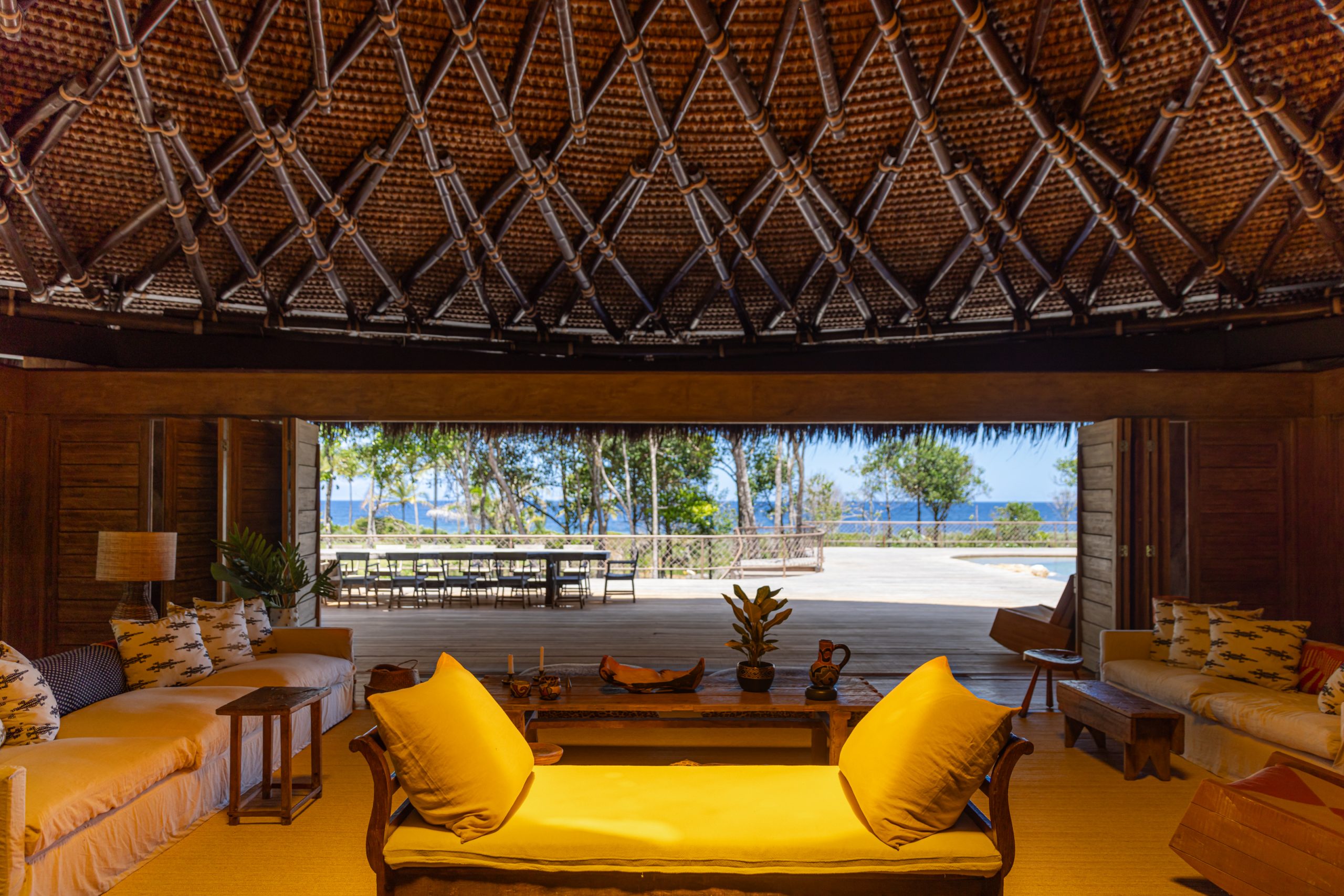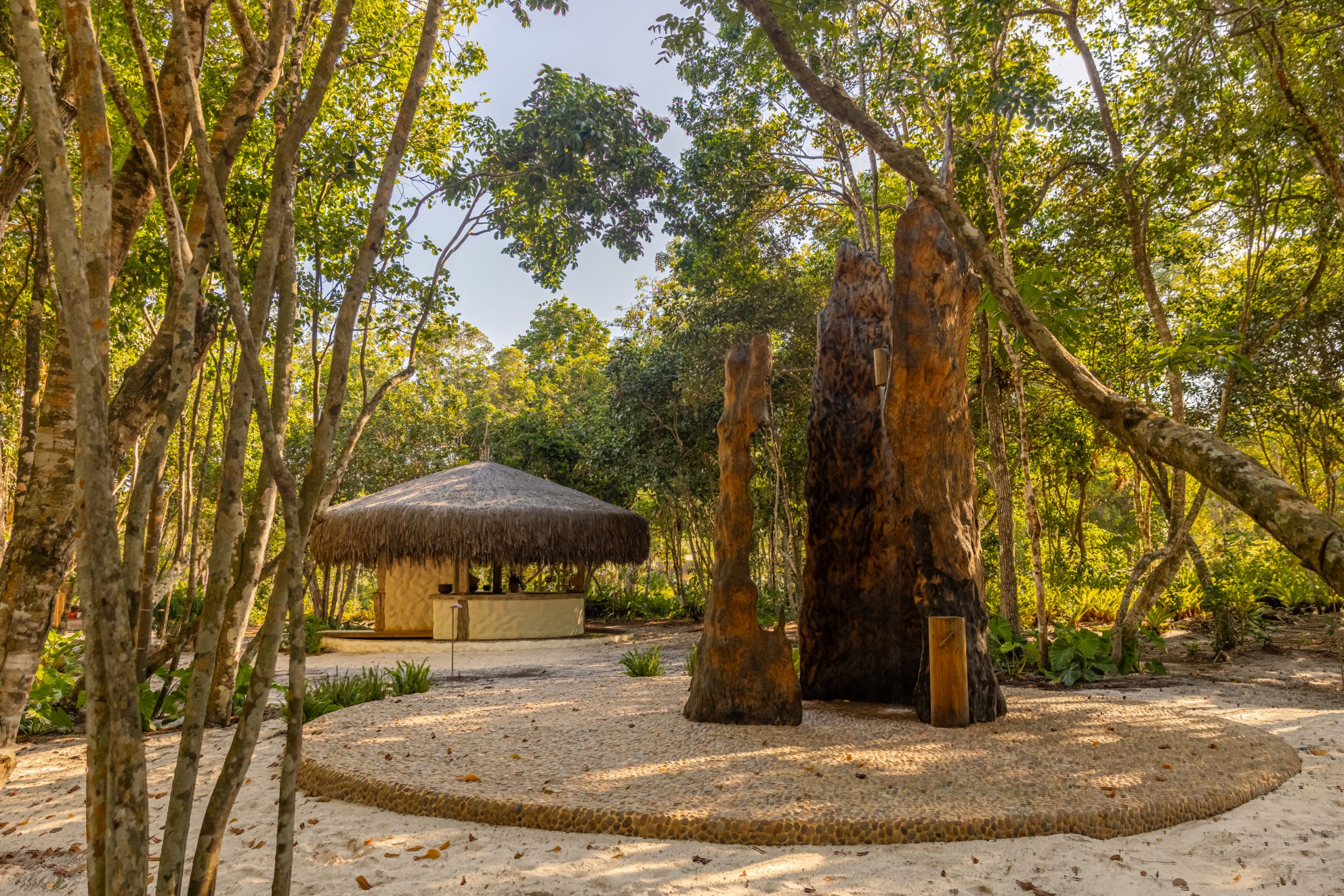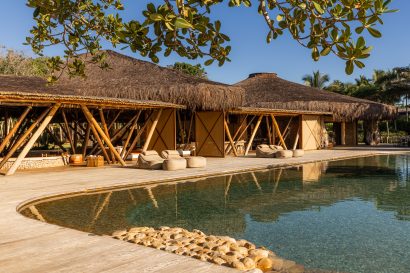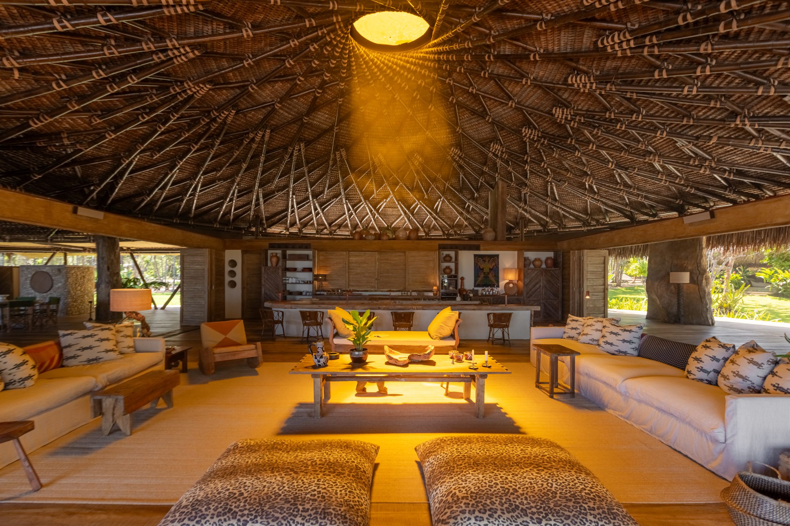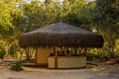 Overlooking the sea, the stone pool harmoniously integrates with the completely open and airy living room. And for even more relaxation, there’s a spa area with a sauna, massage room, and a giant pequi shower, all surrounded by lush tropical forest. Additionally, there’s the “Mandala” space: a large hut for healing therapies, yoga sessions, massages, and much more.
