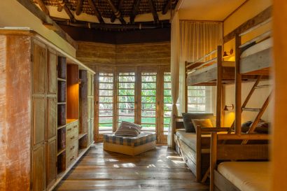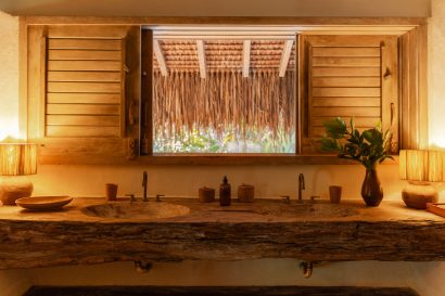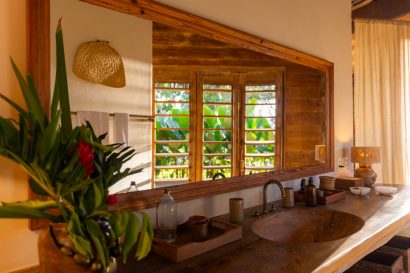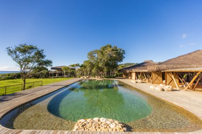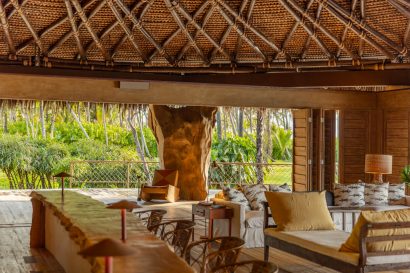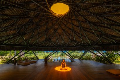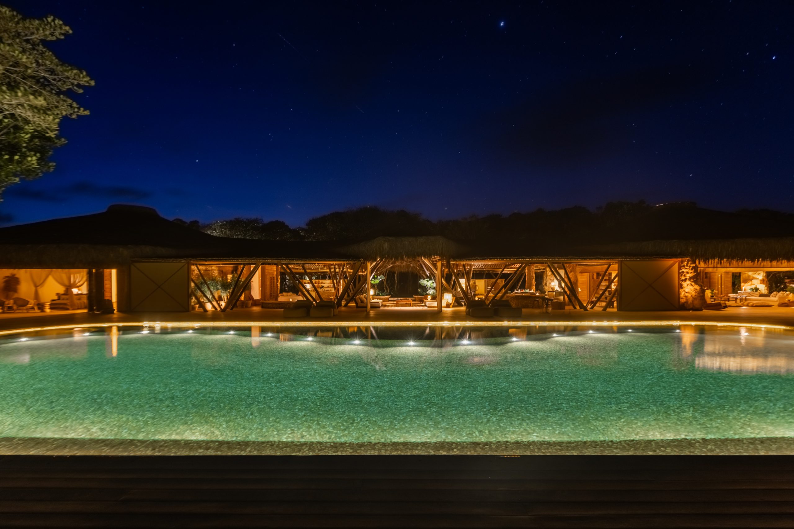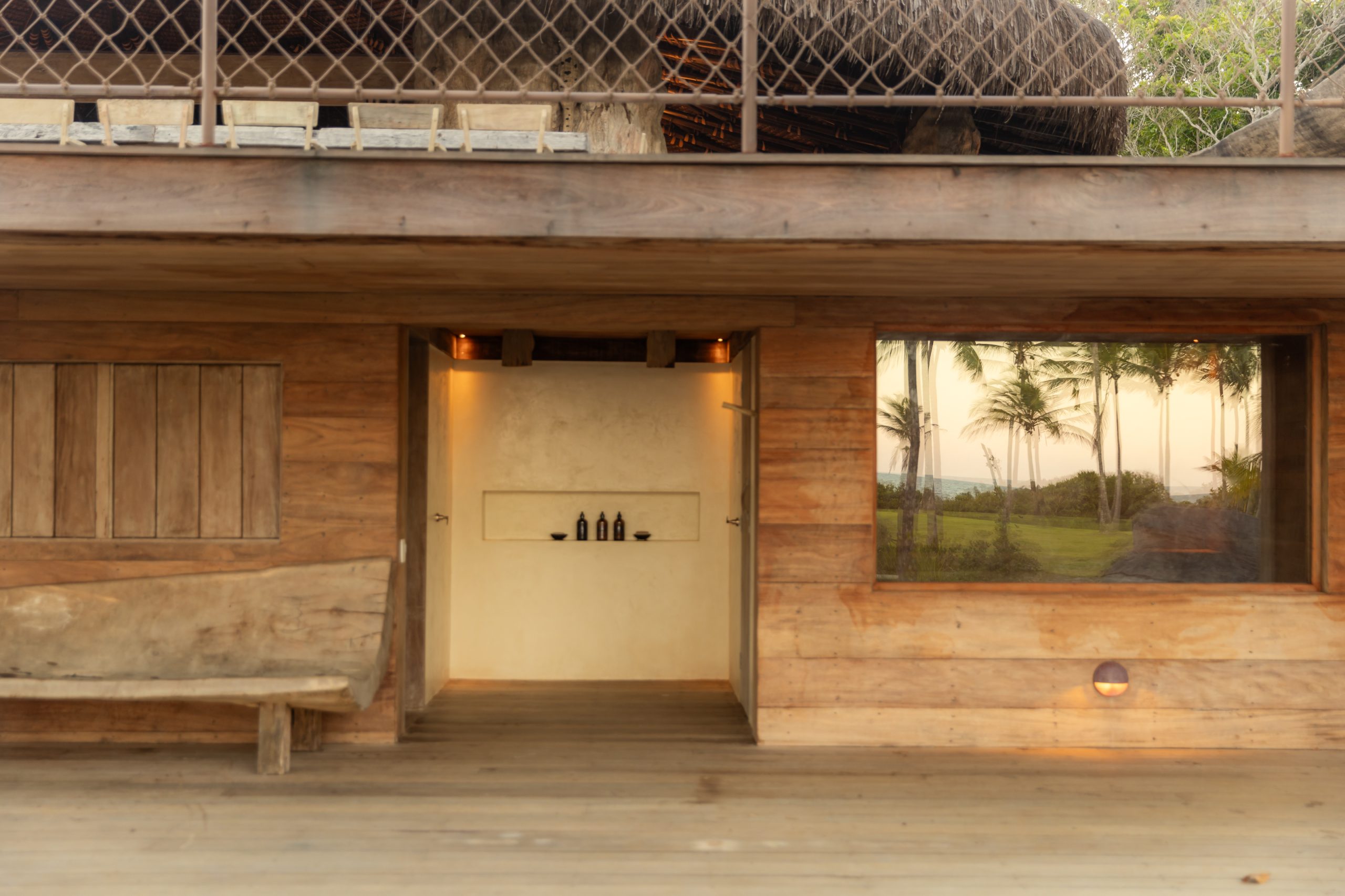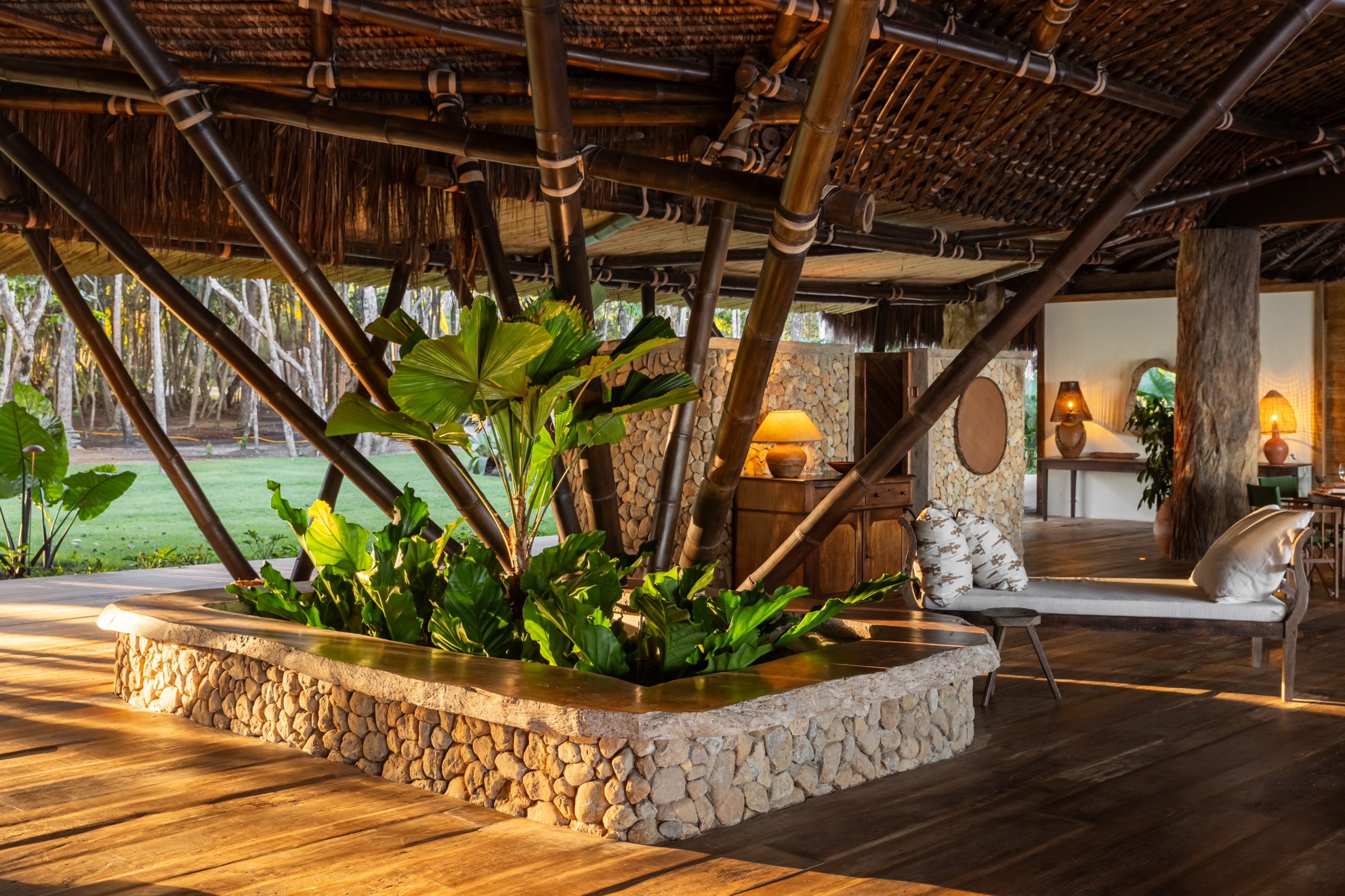 Overlooking the sea, the stone pool harmoniously integrates with the completely open and airy living room. And for even more relaxation, there’s a spa area with a sauna, massage room, and a giant pequi shower, all surrounded by lush tropical forest. Additionally, there’s the “Mandala” space: a large hut for healing therapies, yoga sessions, massages, and much more.