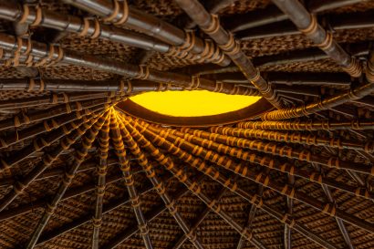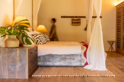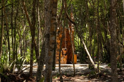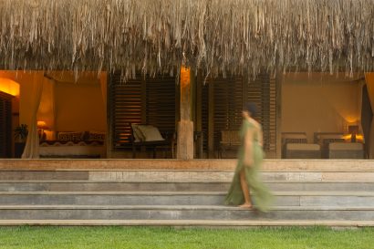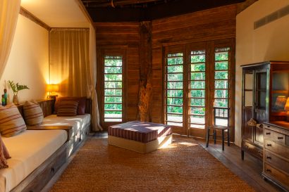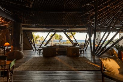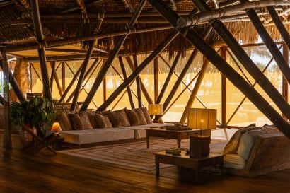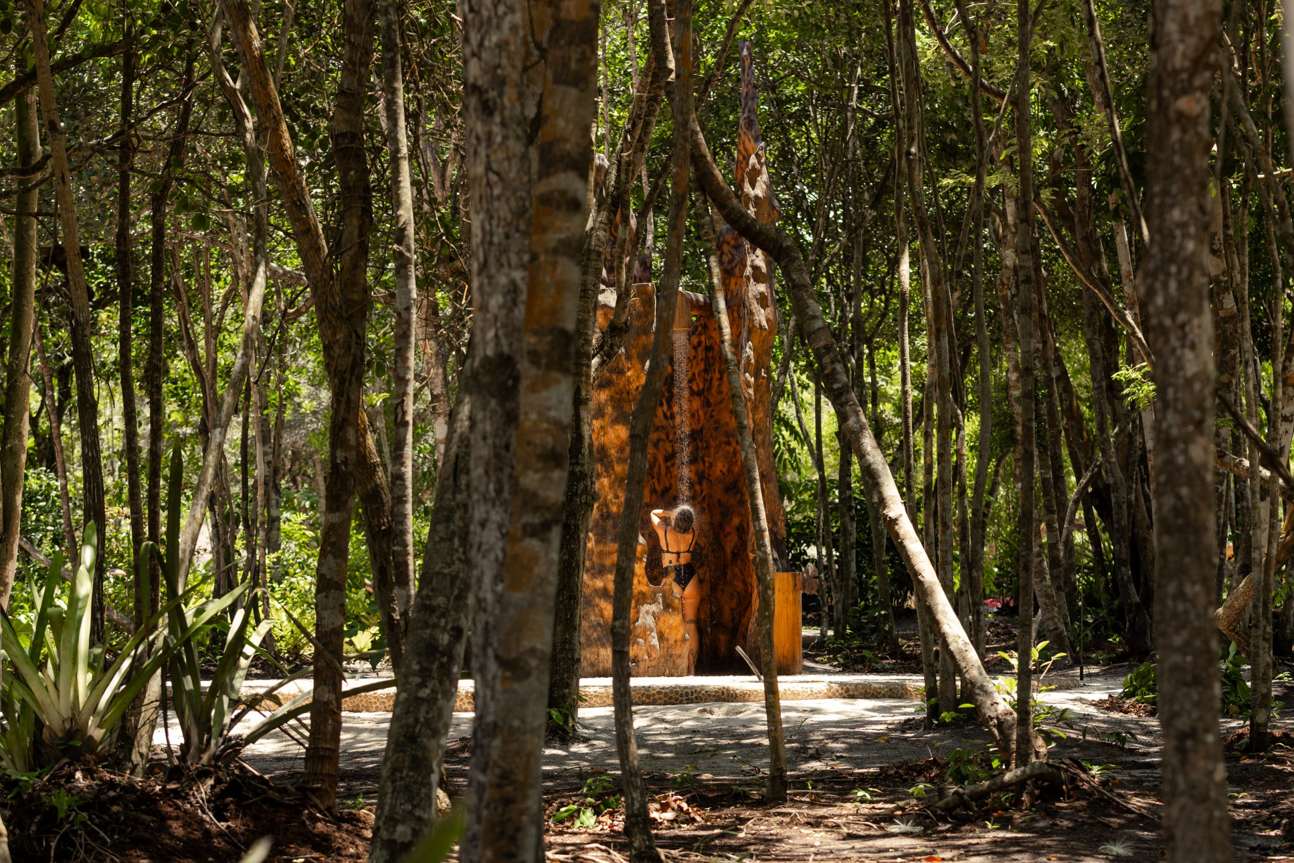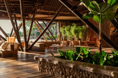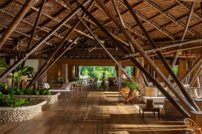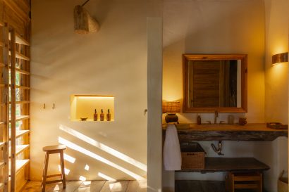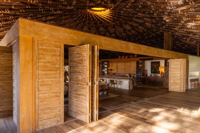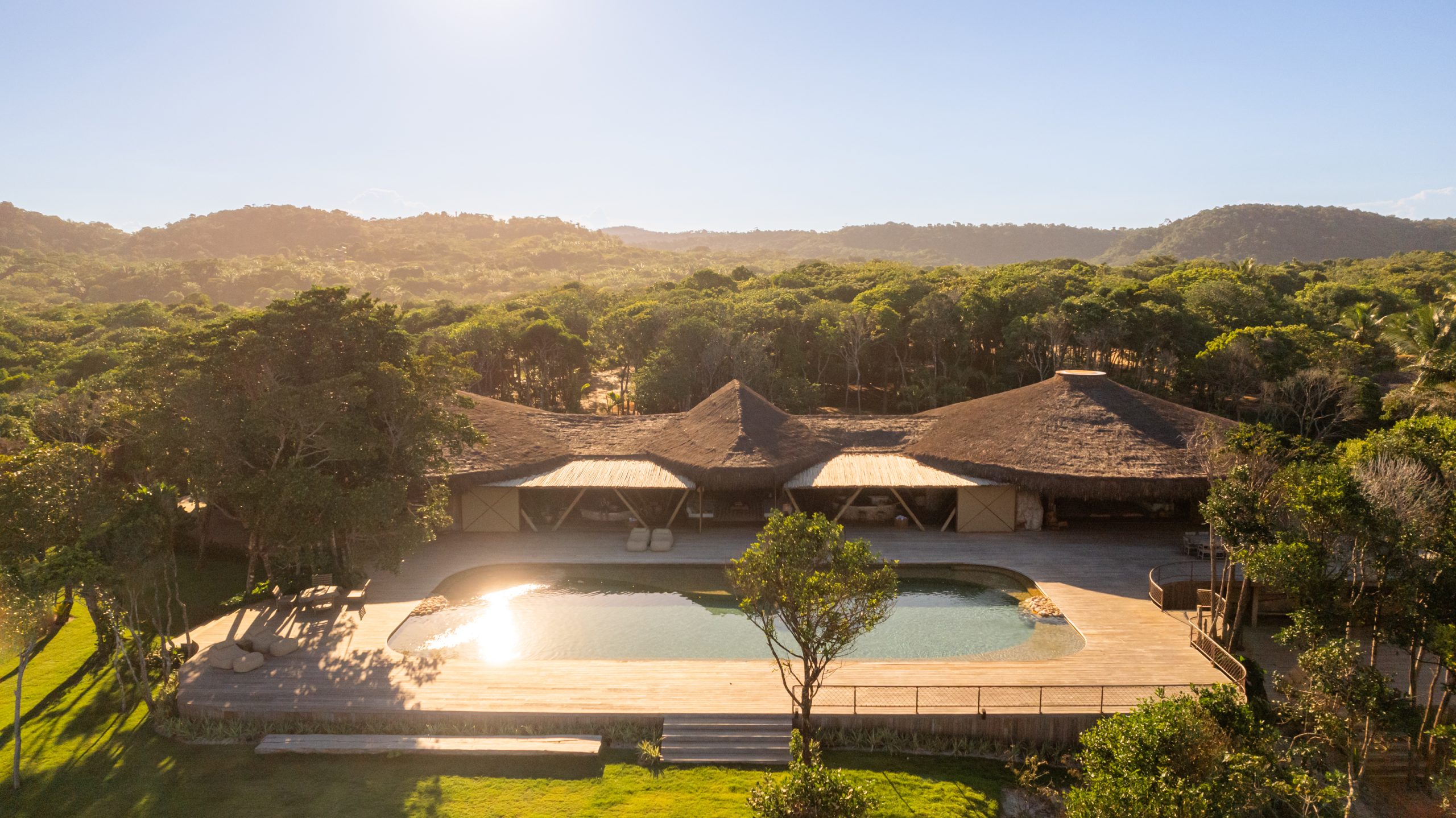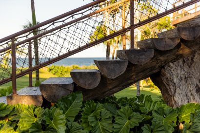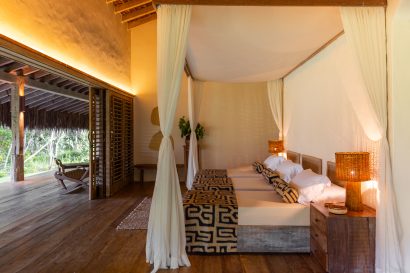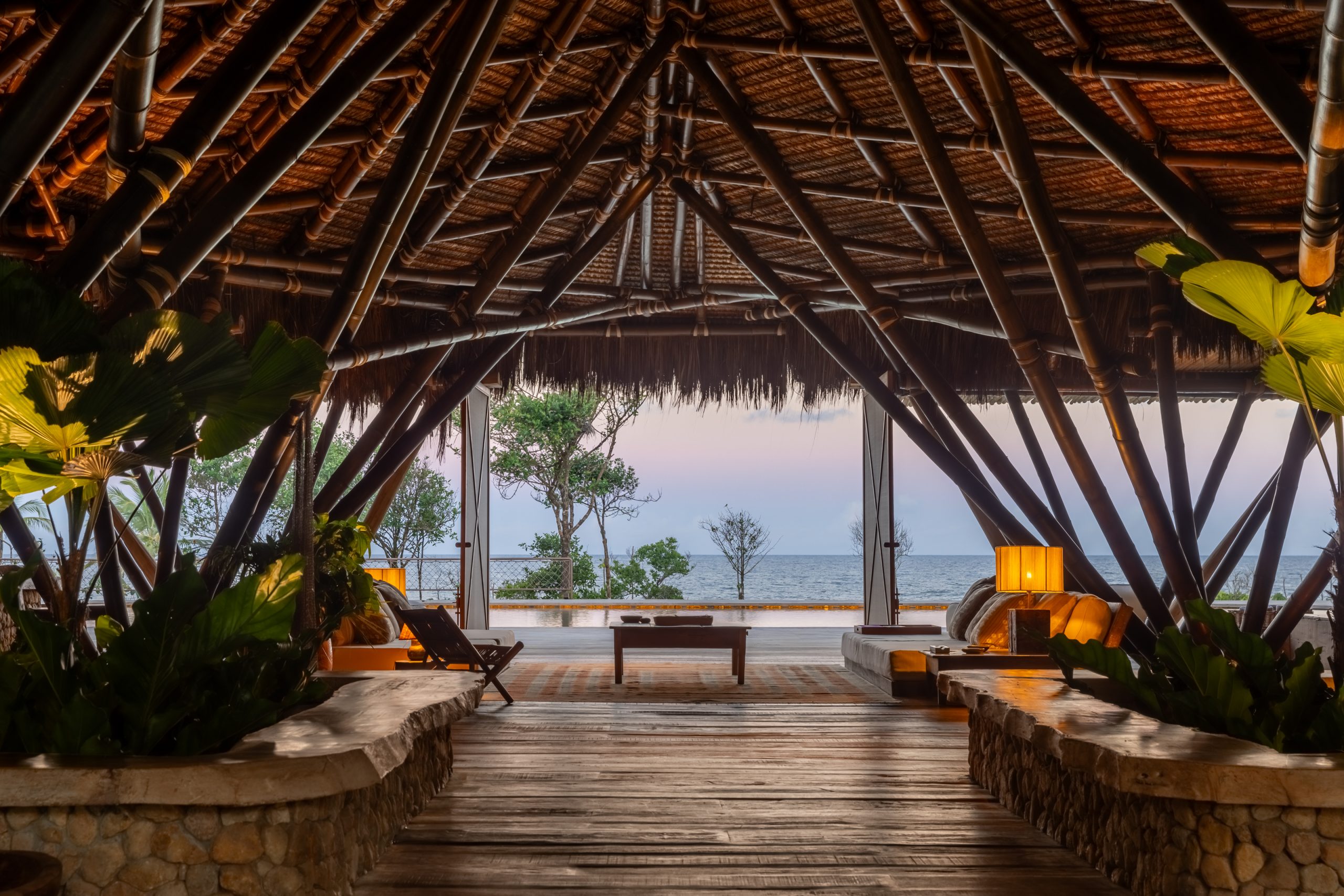 Overlooking the sea, the stone pool harmoniously integrates with the completely open and airy living room. And for even more relaxation, there’s a spa area with a sauna, massage room, and a giant pequi shower, all surrounded by lush tropical forest. Additionally, there’s the “Mandala” space: a large hut for healing therapies, yoga sessions, massages, and much more.